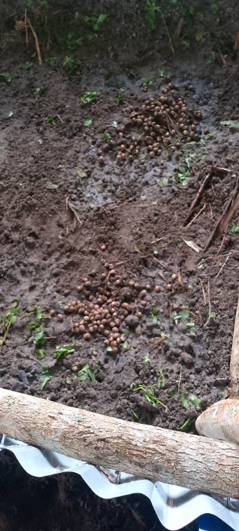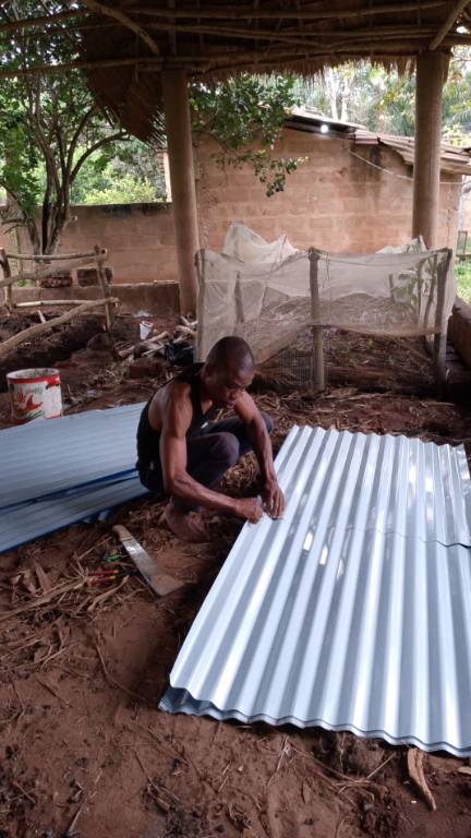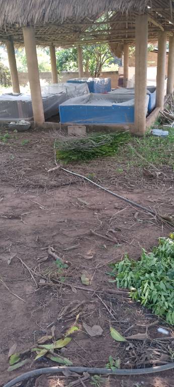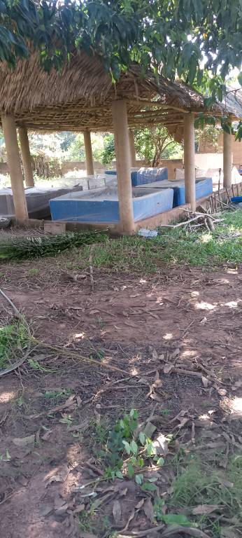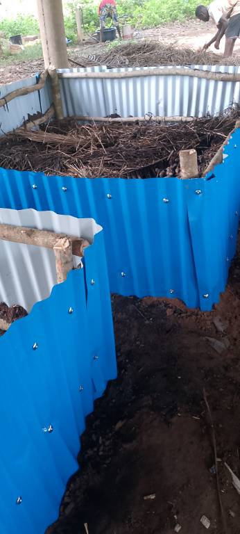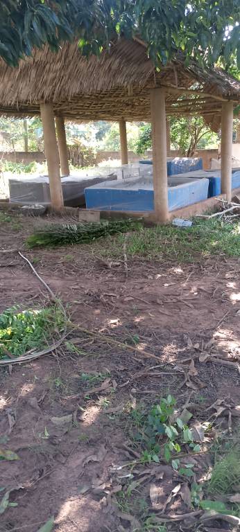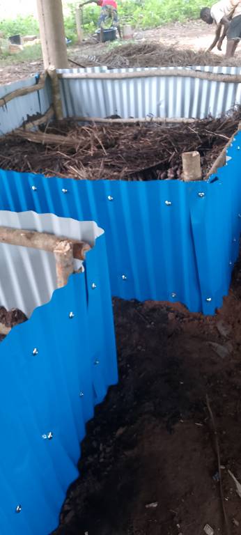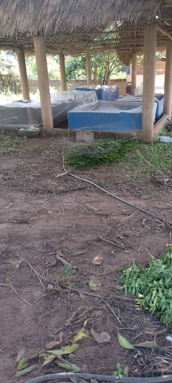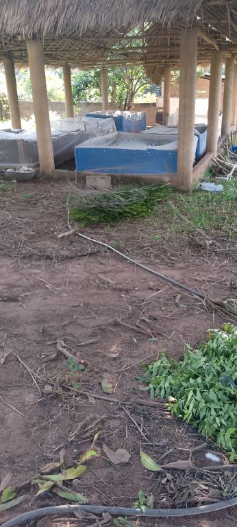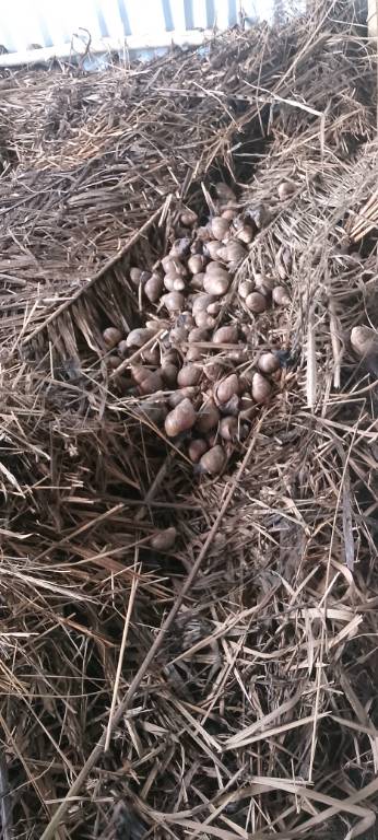 À quoi peuvent bien servir ces contenants de couleur bleu disposés sous la paillote aux escargots ? C’est le résultat des expériences accumulées dans le secteur d’élevage. Nous pensons avoir trouvé la structure adaptée à cette forme d’élevage. Au départ, c’était des caisses en bois, puis, nous sommes passés aux moustiquaires confectionnées en enclos. Enfin, un premier essai en tôle réussi a poussé à adopter ce choix. Son avantage est multiple : la conservation de l’humidité, un paramètre déterminant pour la croissance des escargots, la protection contre les rats en plus d’être un rempart contre les bestioles. En effet, le volume des naissains retrouvés dans cet espace est impressionnant ainsi que le bon développement des limaçons laissés dans cet espace. D’autre part, les enclos ont été tapissés de nervure de palme, lesquelles paraissent plus résistantes que les touffes de chiendents jusqu’ici utilisés.