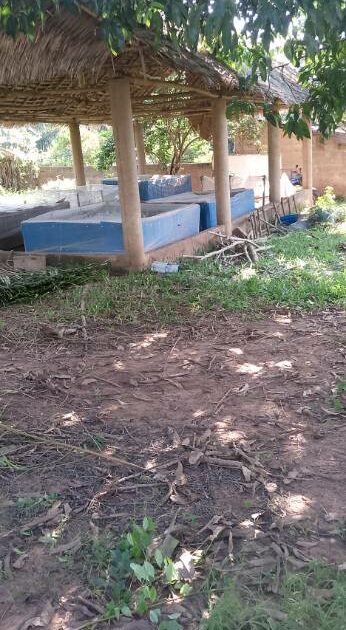 À quoi peuvent bien servir ces contenants de couleur bleu disposés sous la paillote aux escargots ? C’est le résultat des expériences accumulées dans le secteur d’élevage. Nous pensons avoir trouvé la structure adaptée à cette forme d’élevage. Au départ, c’était des caisses en bois, puis, nous sommes passés aux moustiquaires confectionnées en enclos. Enfin, un premier essai en tôle réussi a poussé à adopter ce choix. Son avantage est multiple : la conservation de l’humidité, un paramètre déterminant pour la croissance des escargots, la protection contre les rats en plus d’être un rempart contre les bestioles. En effet, le volume des naissains retrouvés dans cet espace est impressionnant ainsi que le bon développement des limaçons laissés dans cet espace. D’autre part, les enclos ont été tapissés de nervure de palme, lesquelles paraissent plus résistantes que les touffes de chiendents jusqu’ici utilisés.